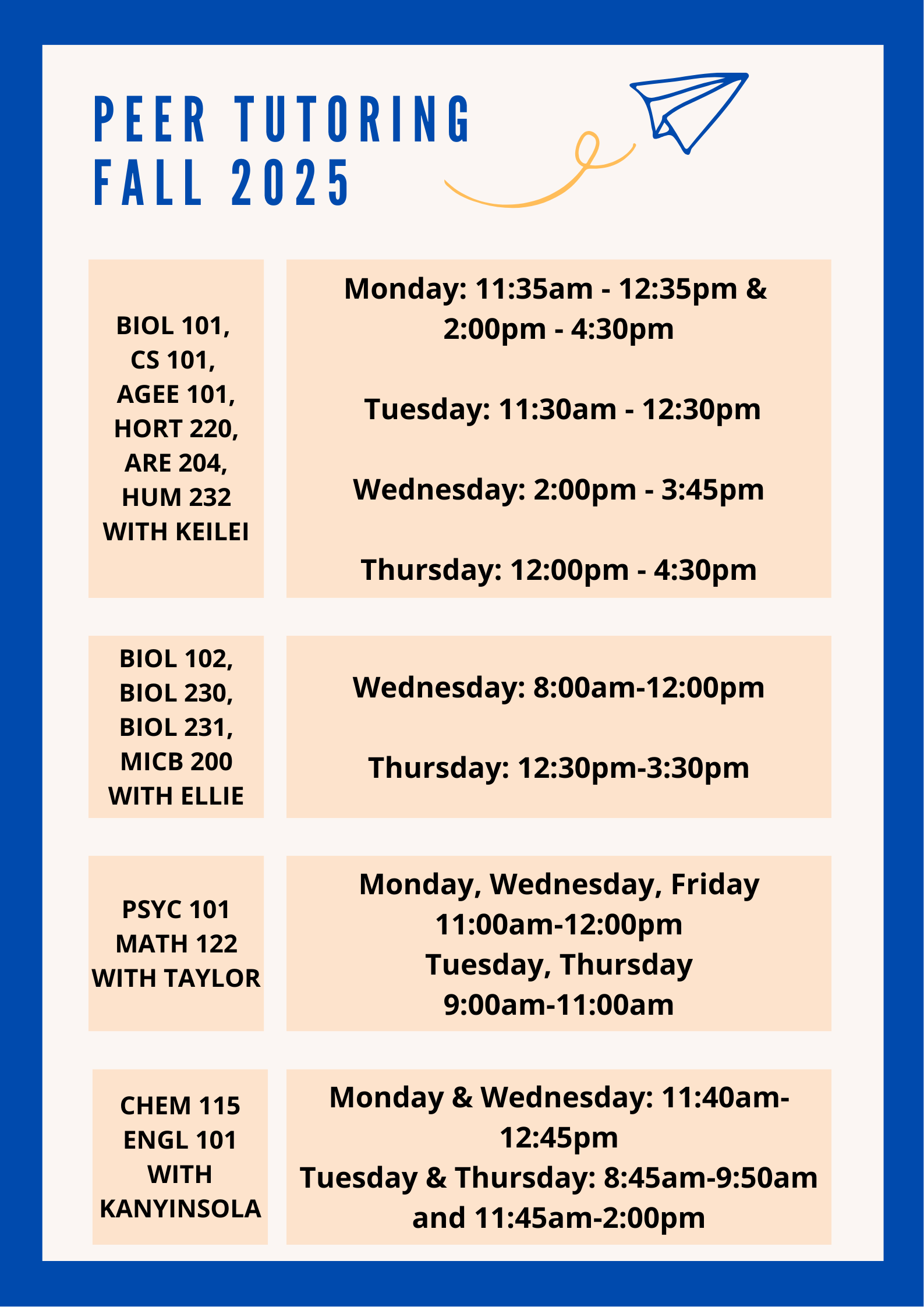 Peer tutors are students that have been carefully selected, trained, and monitored to provide the highest quality of service. Current subject offerings include CHEM 111, CHEM 112, HN&F 171, ENGL 101 & 102, ACCT 201, CS 101, BIOL 102, BIOL 230, and BIOL 231. Click here for the full schedule of walk-in tutoring options! For more information, contact: